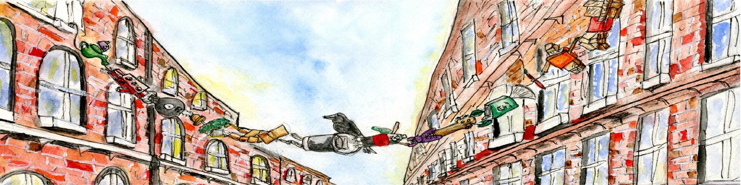 Explore the "Street Spirits" collection, a series of giclée prints based on original watercolor artworks that vividly capture urban charm and whimsy.